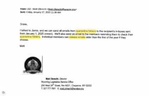 During the hearing, these lawmakers testified that the claim of constituent emails being quarantined and blocked from their lawmaker inboxes was false. They argued that the words “quarantine” and “blocking” are inflammatory and being used by Honor Wyoming to create strife and confusion. But when Honor Wyoming presented emails from the Director of the LSO confirming that messages were being quarantined and kept out of lawmakers’ inboxes—meaning they were, in fact, being blocked—those same lawmakers shifted straight into damage control, attacking Honor Wyoming and playing word games.